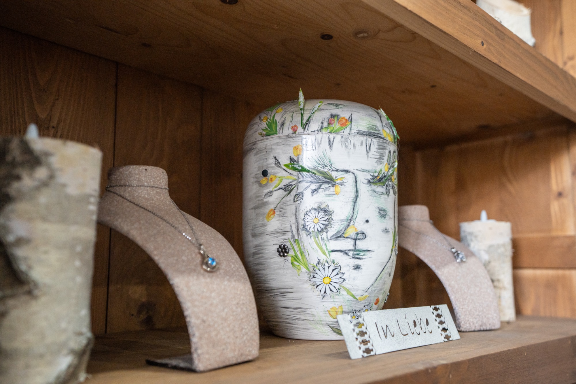 In unserer Werkstatt entstehen individuell gefertigte Urnen und verzierte Särge.